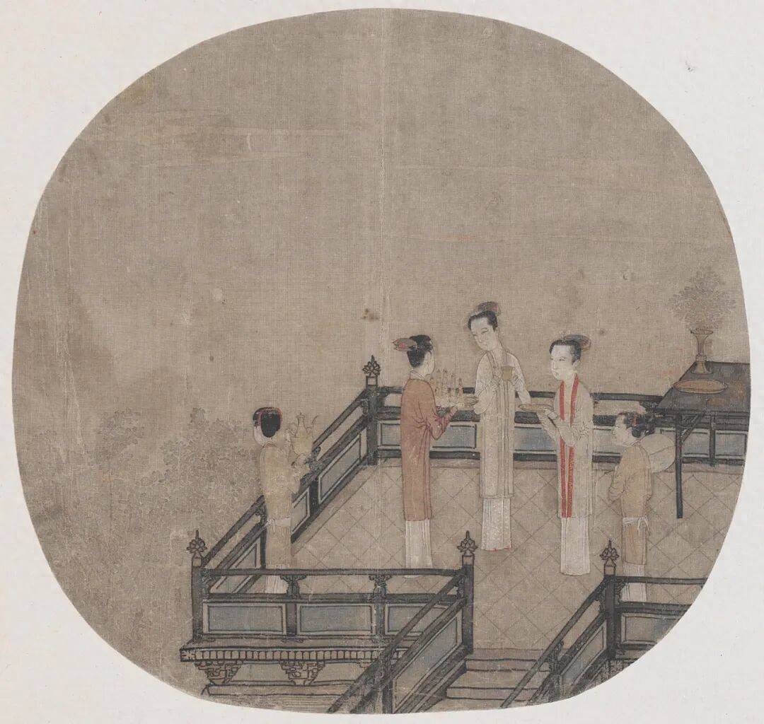 《瑶台步月图》动作南宋刘宗古(传)的经典之作,以中秋仕女赏月为题,在方寸间勾画出宋东说念主的生计好意思学与精神全国。画面中,三位身着褙子长裙的仕女立于瑶台,或捧供品、或握茶盘,与侍女们共构出一幅静谧的月夜图景。台榭雕梁画栋,明月隐现云间,虽无月饼等后世中秋标识,却通过拜月、赏月等细节,收复了宋代中秋“贵家结饰台榭,民间争占酒楼玩月”的盛况。